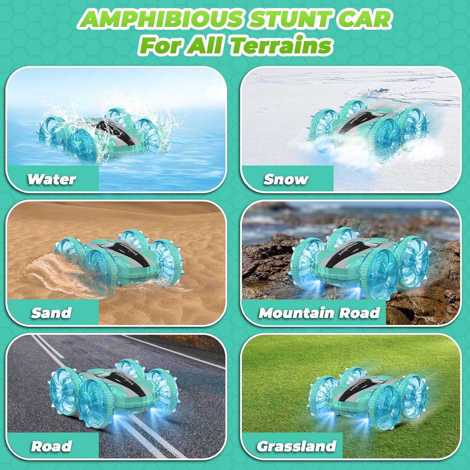 Waterproof Amphibious Design: Drives on land and floats on water. Performs flips and 360° spins on any surface—water, beach, snow, grass, or rocks.
